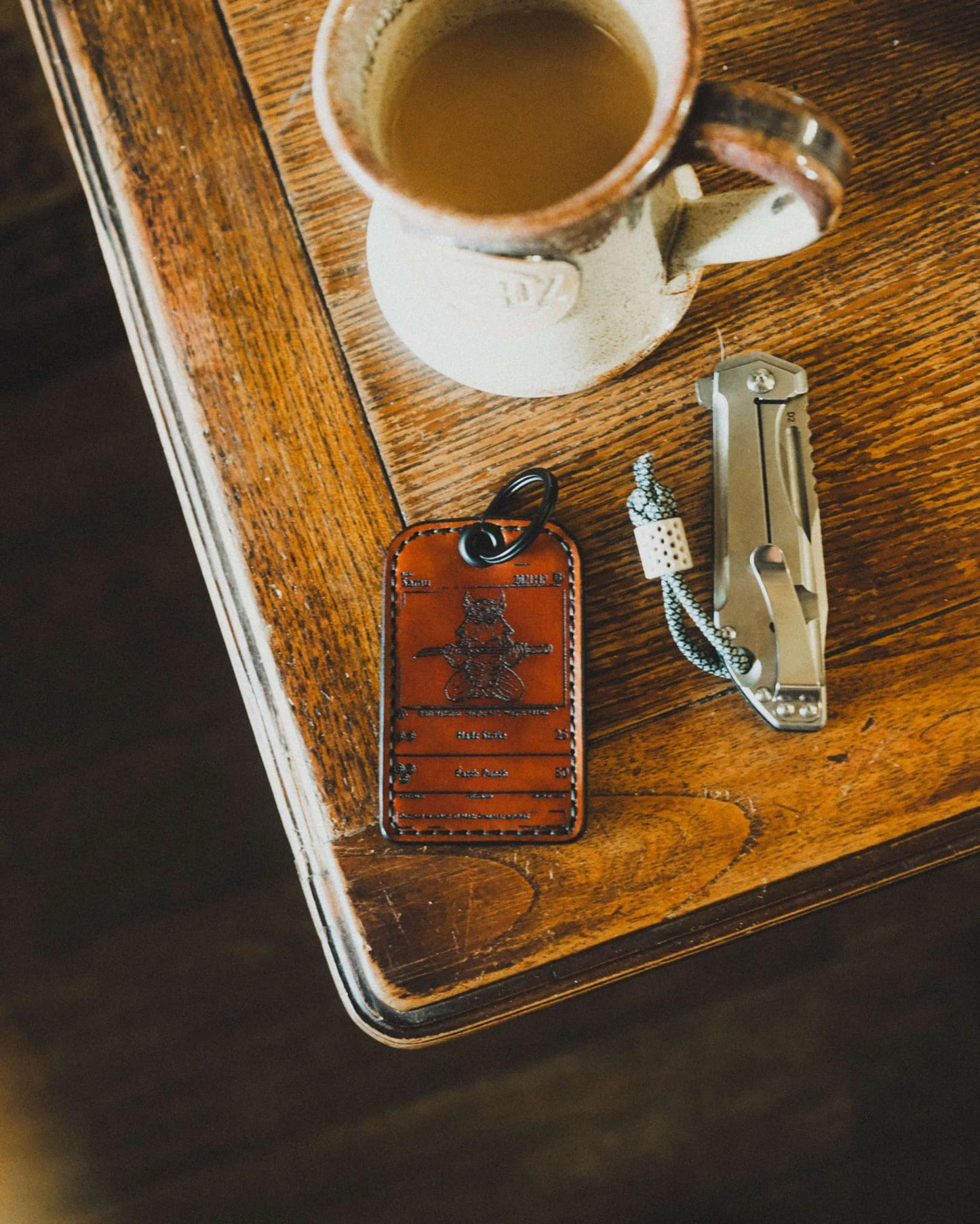 - Artwork is a laser engraved Samu in the style of an ancient TCG card!- Leather is dyed and sealed by hand to give the leather a unique texture.